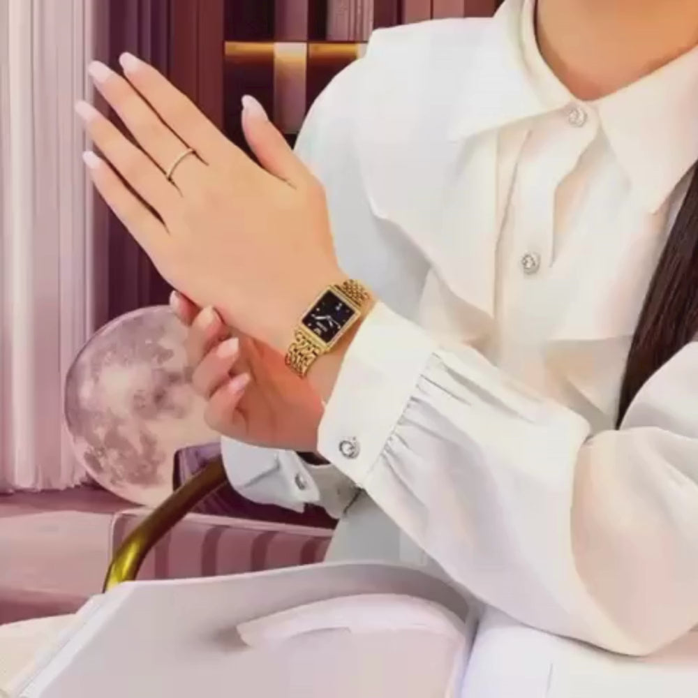 Design atemporal e delicado: o mostrador retangular e a pulseira dourada exalam sofisticação e feminilidade.